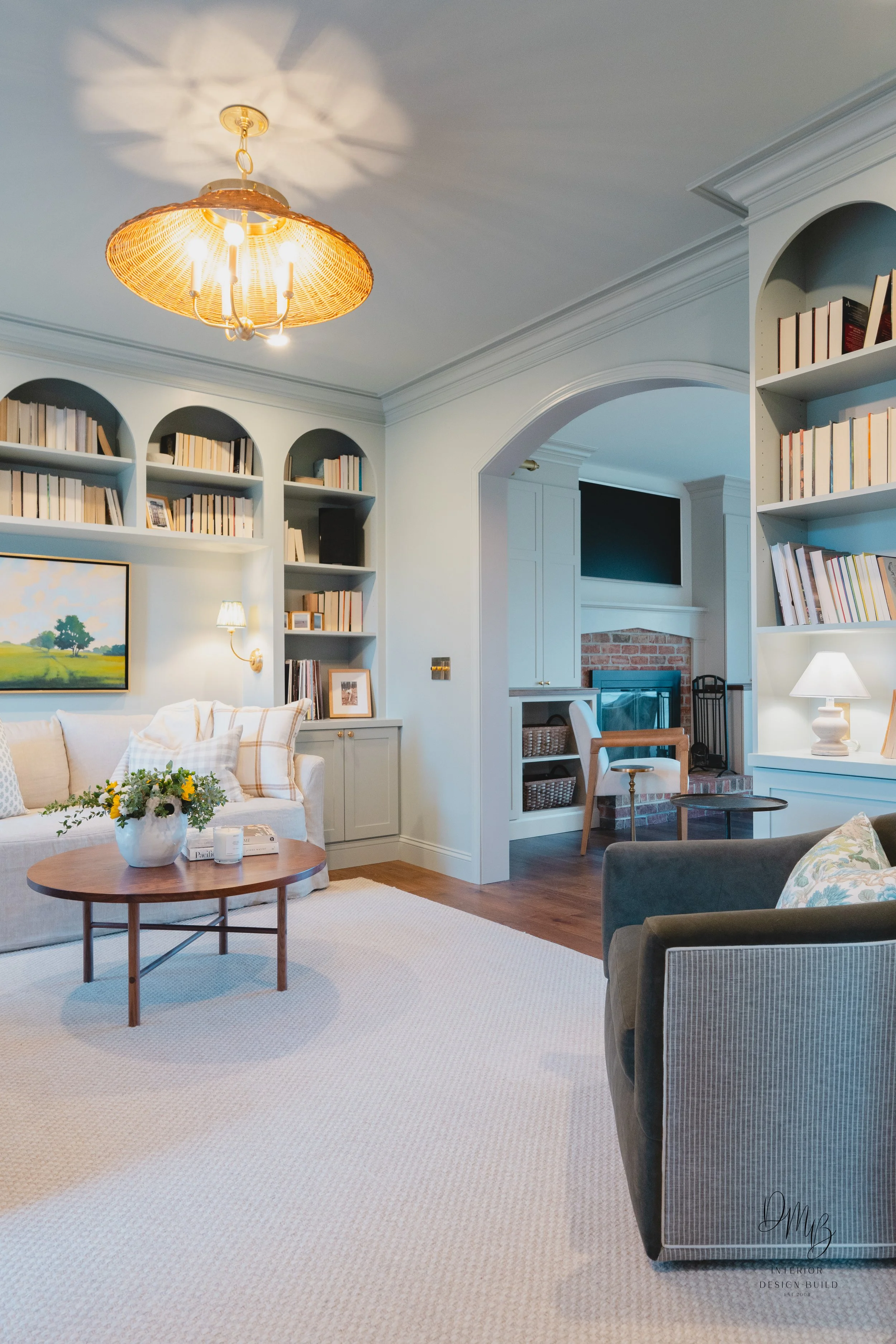 At the heart of the design are custom built-in bookcases, detailed with soft arches at the top of each section. These arched forms aren’t isolated to this room - they echo the arched doorways found throughout the home and the curved cabinet doors in the dining room. This detail creates subtle architectural rhythm across the entire first floor.