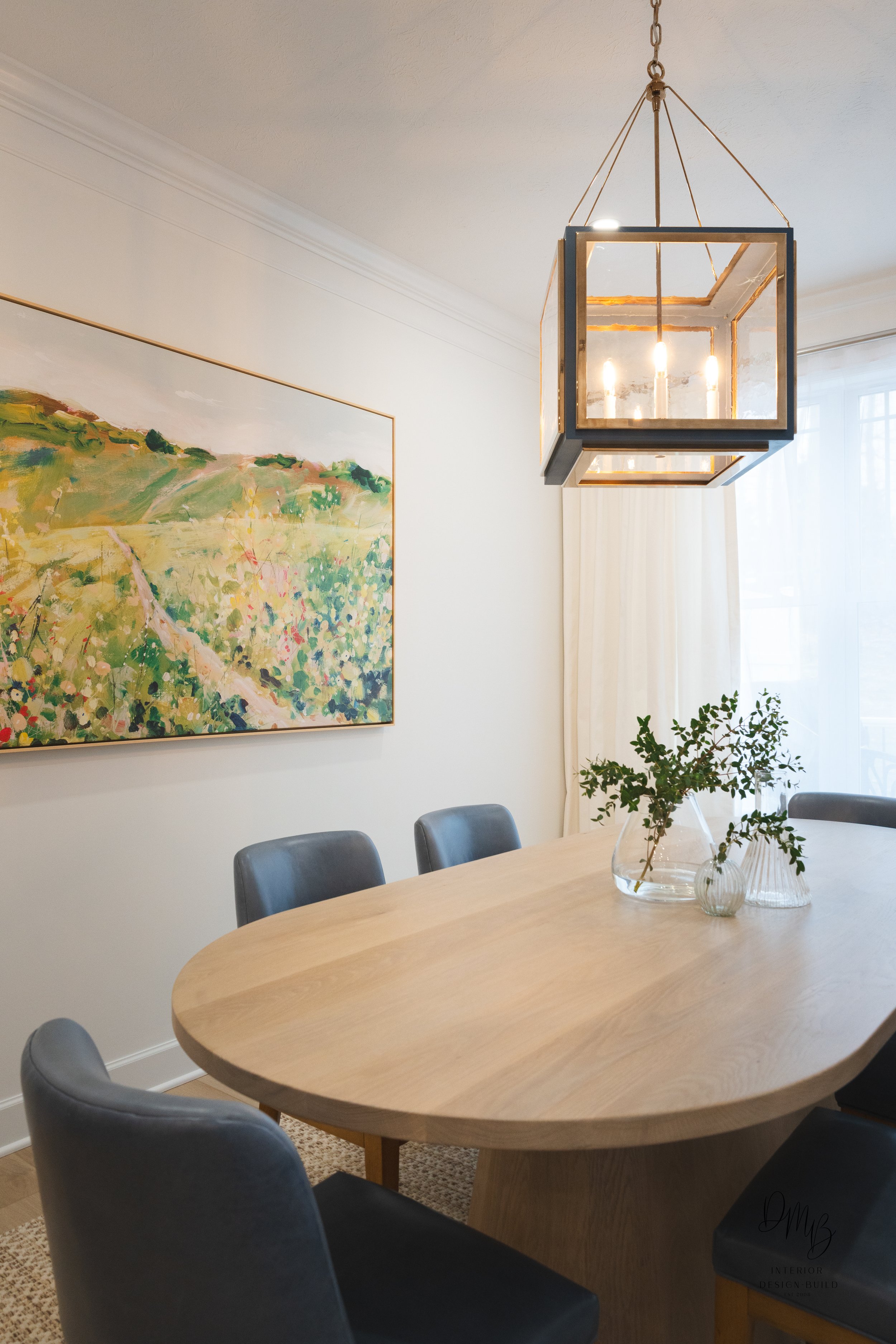 One of the most defining moments in this home is the dining room. An Urban Electric chandelier in heirloom brass and Dutch blue anchors the space, offering a refined pop of color without overwhelming the room. Beneath it, a solid white oak dining table grounds the space, paired with blue leather dining chairs that quietly reinforce the color palette.