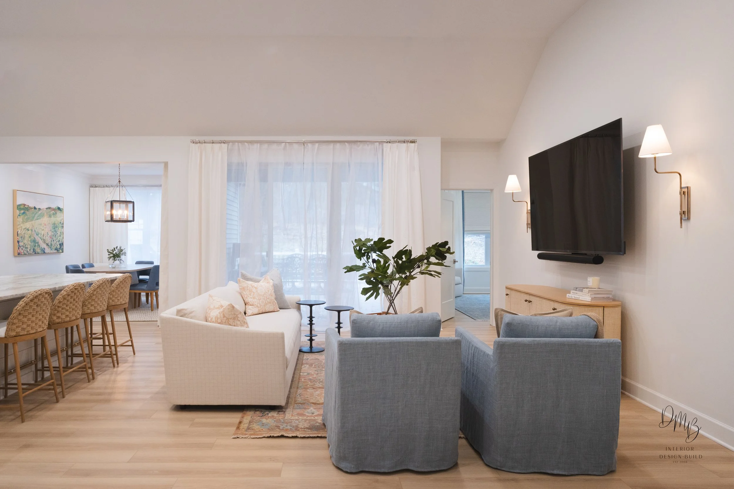When this new-build town home in Fairport, NY was nearly complete, the homeowners came to us with a clear feeling in mind. Having spent much of their year in Naples, Florida, they wanted their Rochester home to reflect the same sense of lightness and ease. Our goal was to design a home for them that provided this without leaning too literal or out of place for its setting. Our role in this project focused on soft design: furniture, finishes, lighting, and layers that would bring warmth, personality, and a subtle coastal sensibility to the home, while remaining grounded in its surroundings.