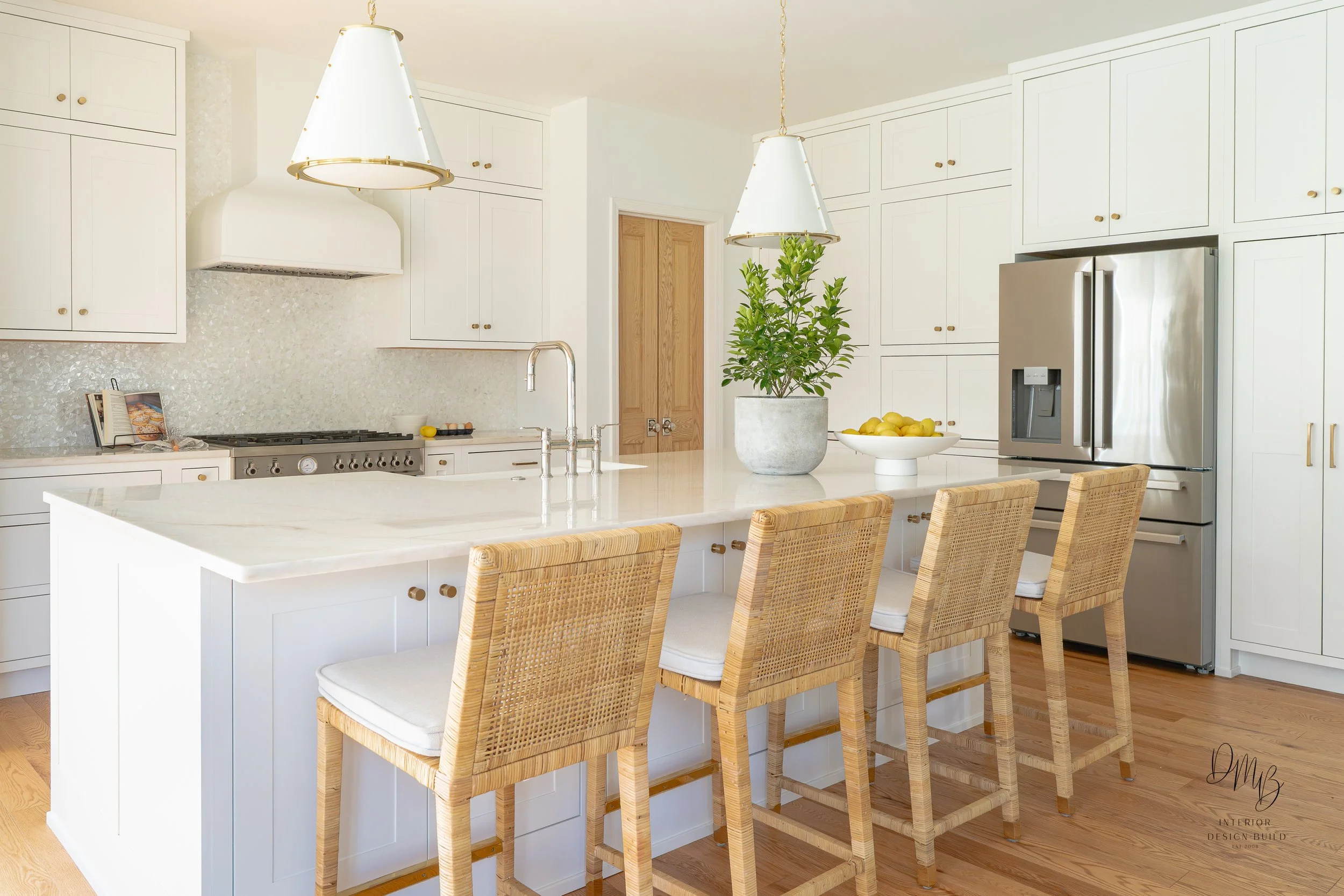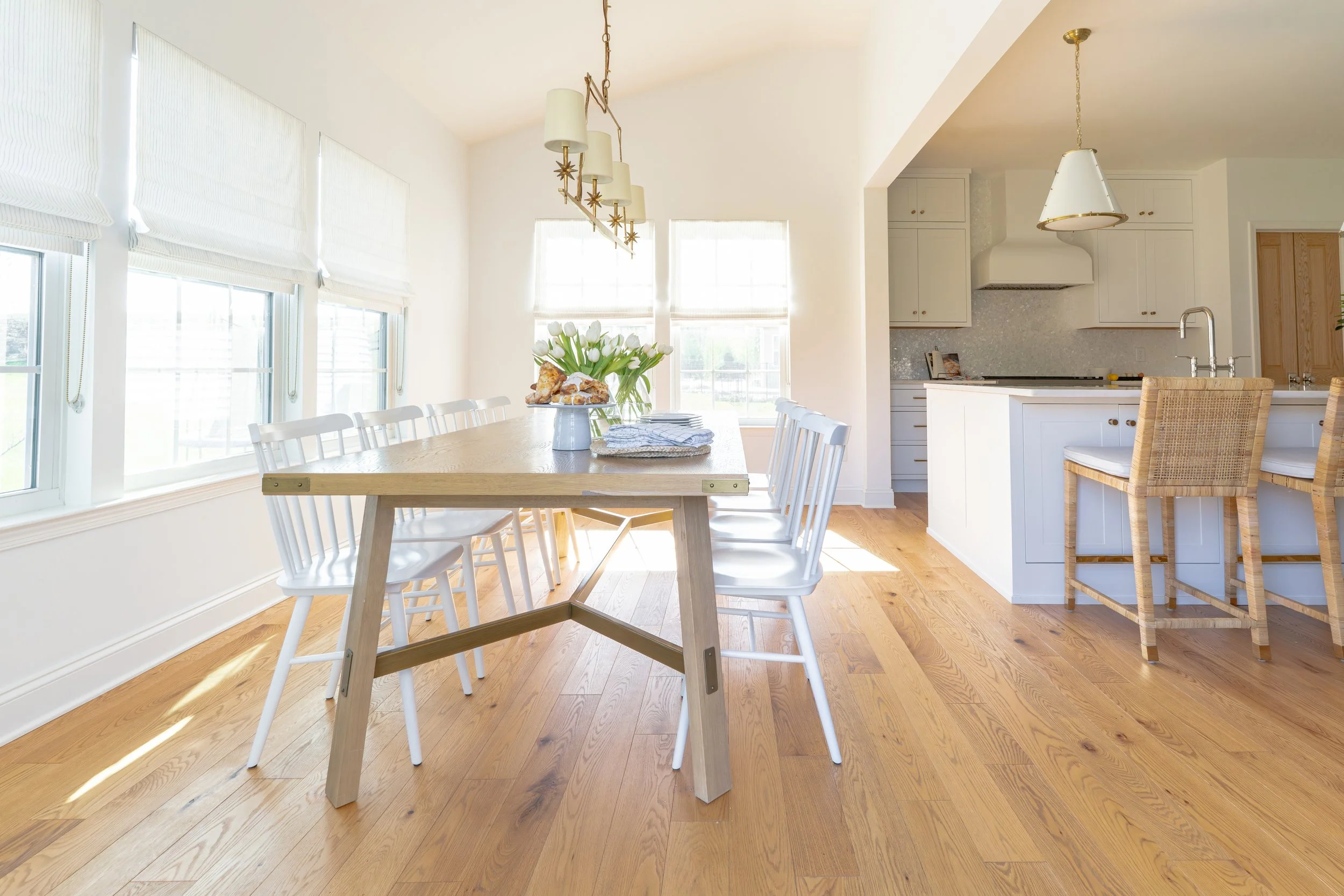 A bright, traditionally inspired first-floor renovation shaped by thoughtful and intentional design, The Georgia reimagined a highly structured home through cohesion, clarity, and livability. This renovation spanned the kitchen, dining room, mudroom, powder room, family room, piano room, and an upstairs primary bathroom. This project carefully balances architectural limitations with refined problem-solving. Rather than relying on major structural changes, the design focused on reworking existing spaces to improve function and flow. Rooms were consolidated and reassigned to better support the rhythms of everyday life for a busy family of six, allowing each space to serve a clear and purposeful role within the home.